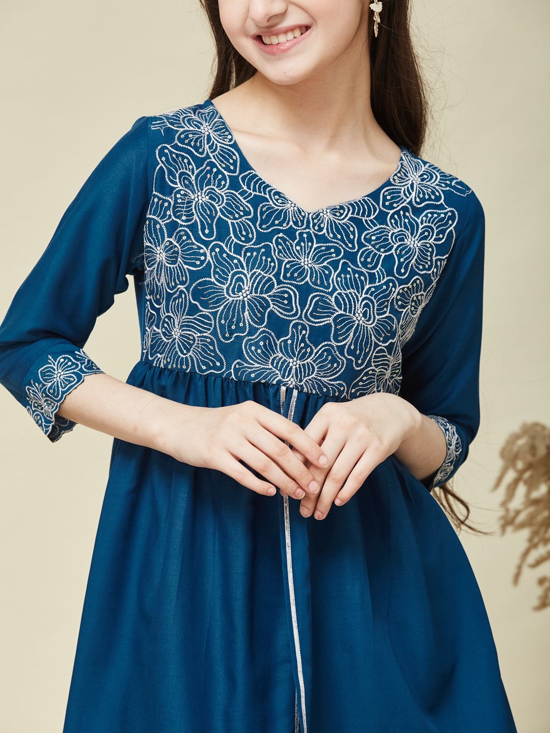 Blue and white embroidered Tunic ,has a round neck, three-quarter sleeves